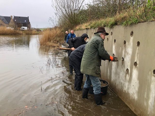 Op vrijdagmorgen 13 februari (regen) heeft een groepje vrijwilligers van onze vereniging de kunstbroedwand voor Oeverzwaluwen in het Harderwijkse Crescentpark weer klaar gemaakt voor het nieuwe broedseizoen. Niet alle 108 beschikbare gaten waren vorig jaar door de zwaluwen benut, maar nu zijn ze alle weer van vers aangestampt zand voorzien. Eind maart arriveren de eerste groepjes zwaluwen terug uit hun Afrikaanse overwinteringsgebied en uit ervaring van voorgaande jaren weten we dat ze de bewuste wand in een ommezien weer weten te vinden en kan de toeschouwer genieten van een werveling van vogels voor de broedgaten.